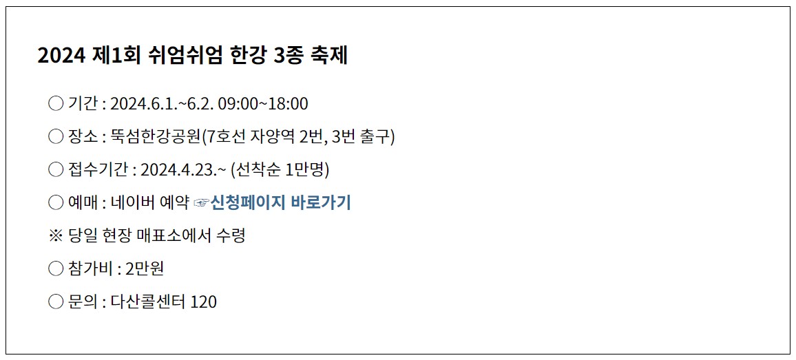 참가신청은 4월 23일 부터 쉬엄쉬엄 한강 3종 축제 검색 후 네이버 예약을 통해 신청을 할수 있습니다.