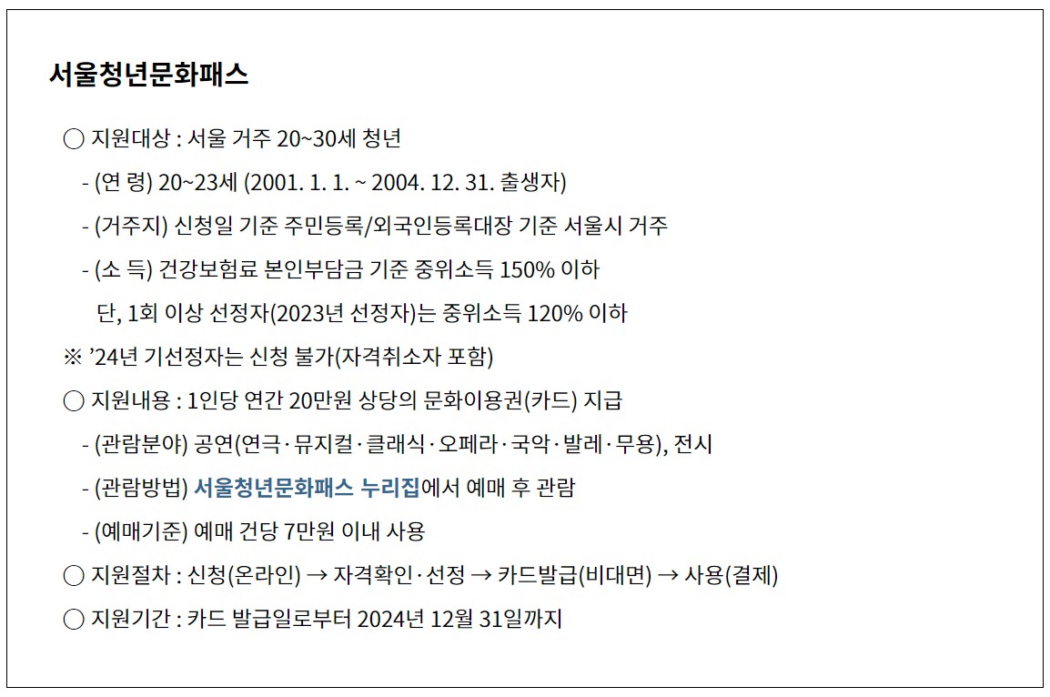서울청년문화패스는 서울시가 2023년 전국 최초로 도입한 사업으로 서울 거주 중위소득 150% 이하