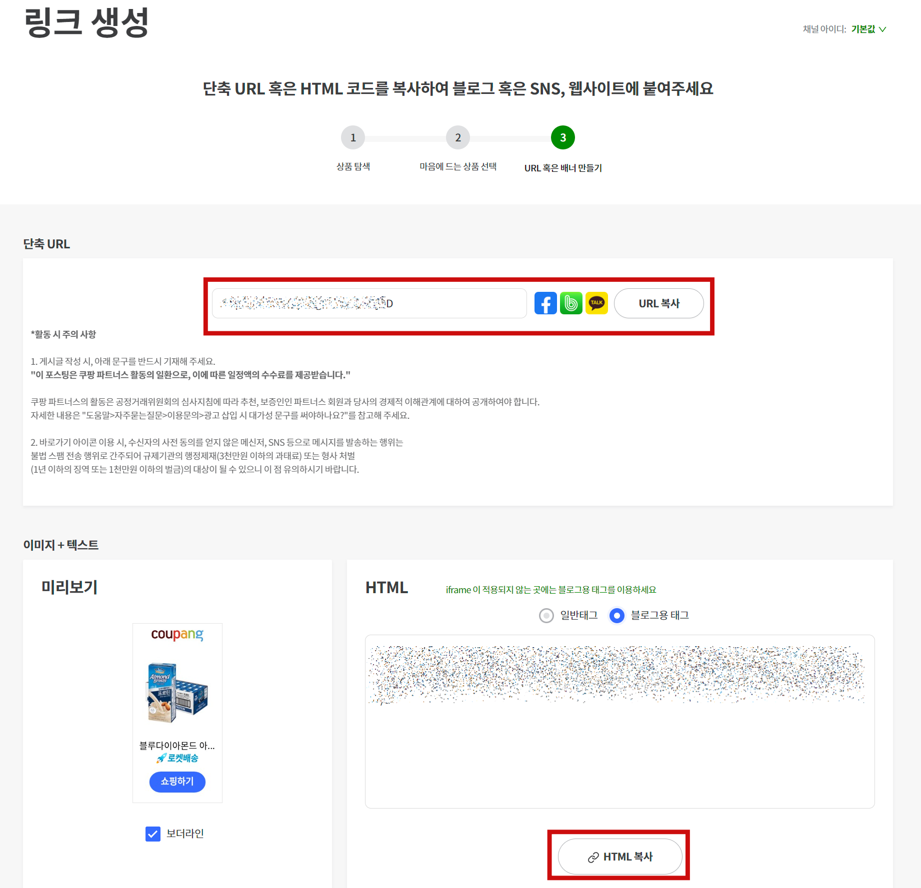 (3) 상품의 URL을 복사하여 직접 링크를 붙여넣거나 HTML을 복사하여 이미지와 텍스트를 노출시켜 단순히 URL을