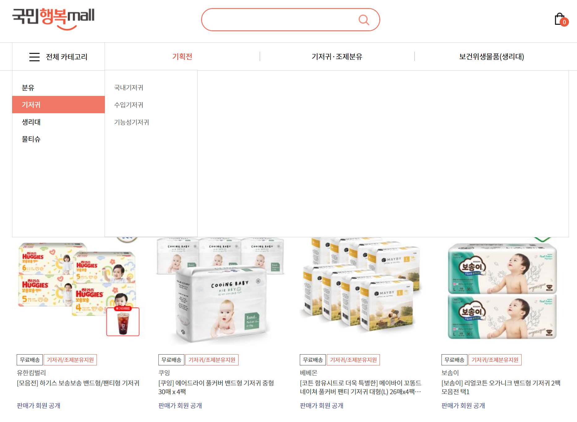 국민바우처 포인트로 구매 가능한 모든 기저귀, 분유가 상품 등록되어 있어 이 사이트에서